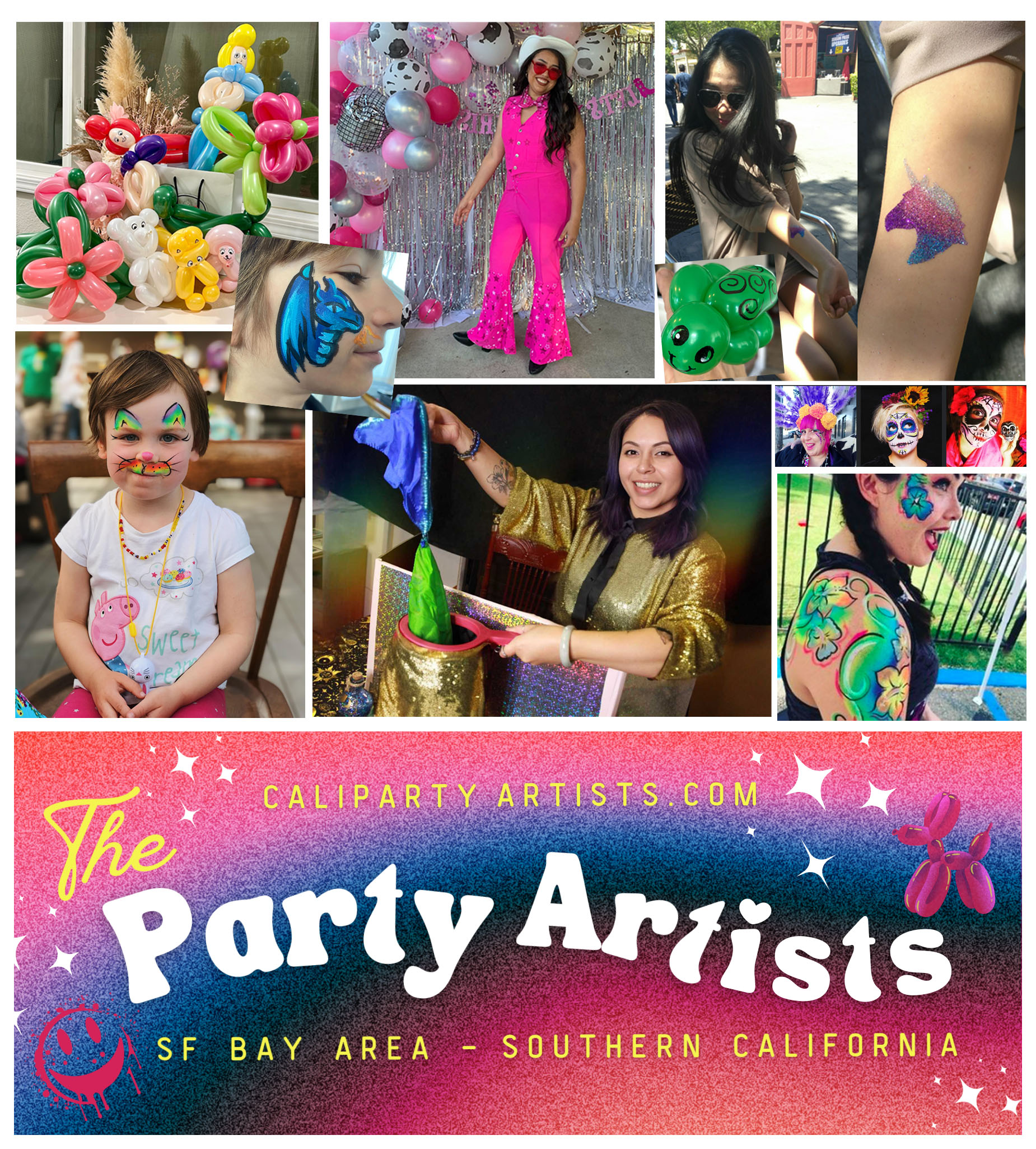 Our event entertainers can provide a vibrant array of offerings to enhance any occasion! From whimsical face-painting and intricate balloon-twisting to the nostalgic charm of photo-booths and the enchantment of costumed entertainers, we tailor experiences to delight guests of all ages. Our skilled juggler captivates audiences with his dexterity, while our mesmerizing bubble shows add an air of wonder to any gathering. For those seeking a captivating magic shows astound and amaze. Whether it’s engaging organized games or the personalized touch of custom balloon decorations, we bring creativity and excitement to every event. Servicing both the southern California LA and San Francisco Bay areas, we ensure unforgettable memories wherever the celebration may be.